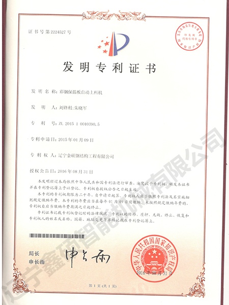 Invention patent of automatic feeding machine for color steel insulation board